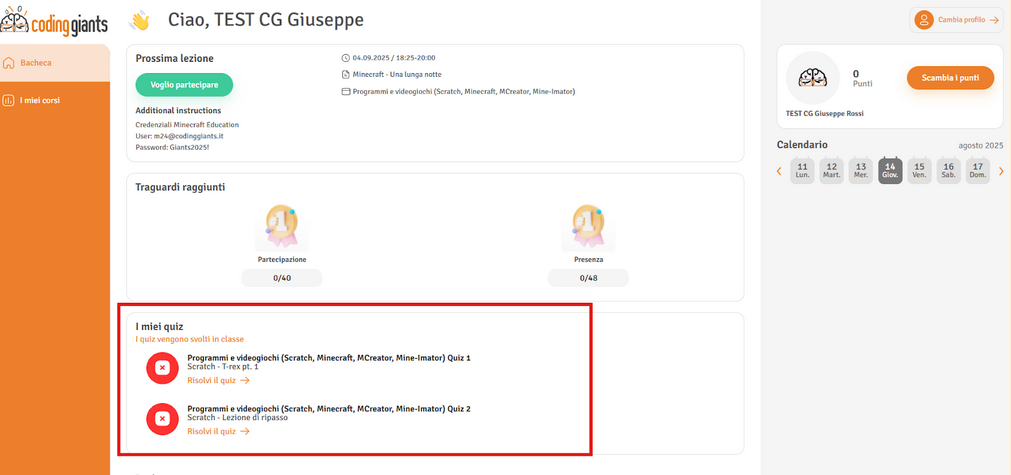 Le informazioni sui quiz che gli studenti e le studentesse devono completare sono visibili nella Dashboard del pannello studenti.
