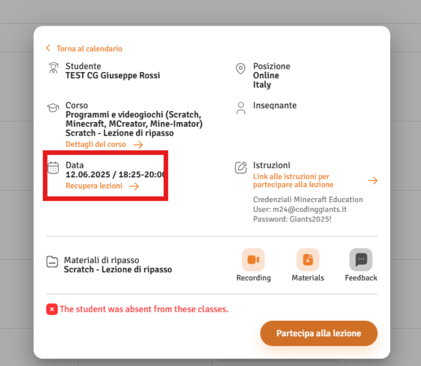 Per programmare una lezione di recupero, accedi al pannello cliente del genitore e segui questi passaggi: